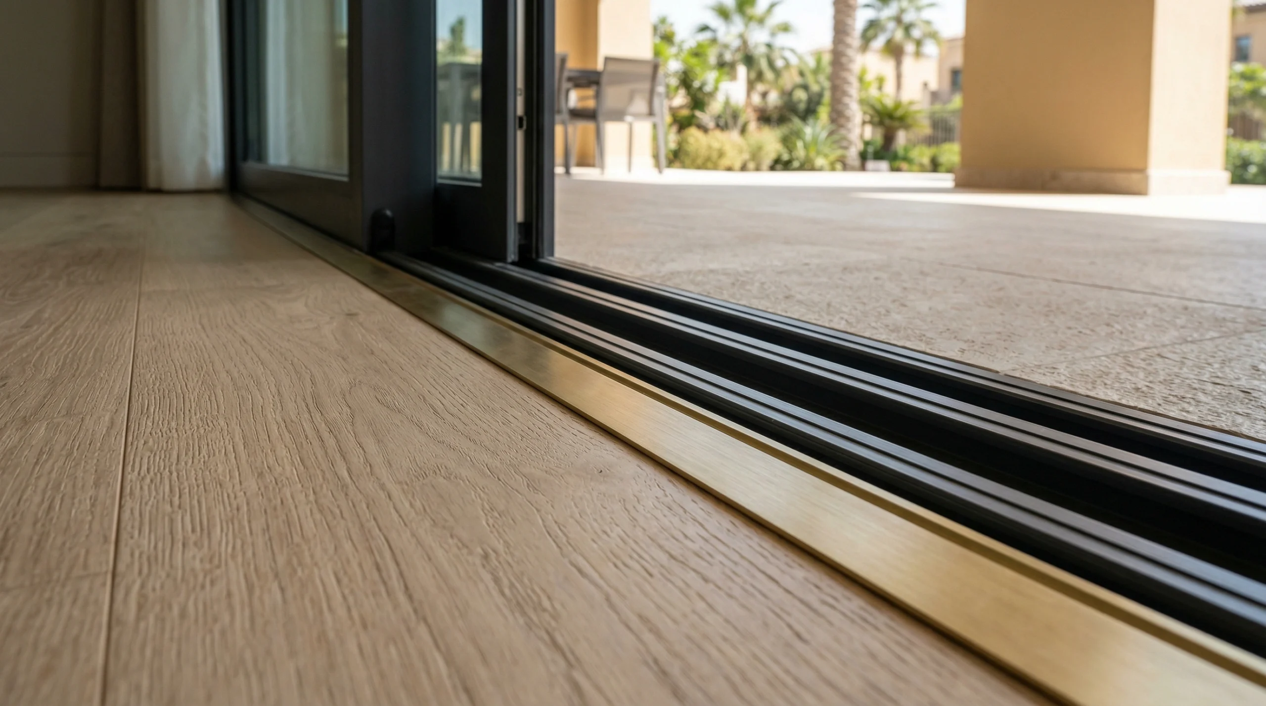Threshold plates at exterior doors require waterproof sealing because these locations see direct water exposure during rain or cleaning. We bed aluminum thresholds in silicone sealant, creating weatherproof barriers that prevent moisture penetration into flooring edges. This detail prevents the edge swelling and delamination visible in installations where rain blows under doors.