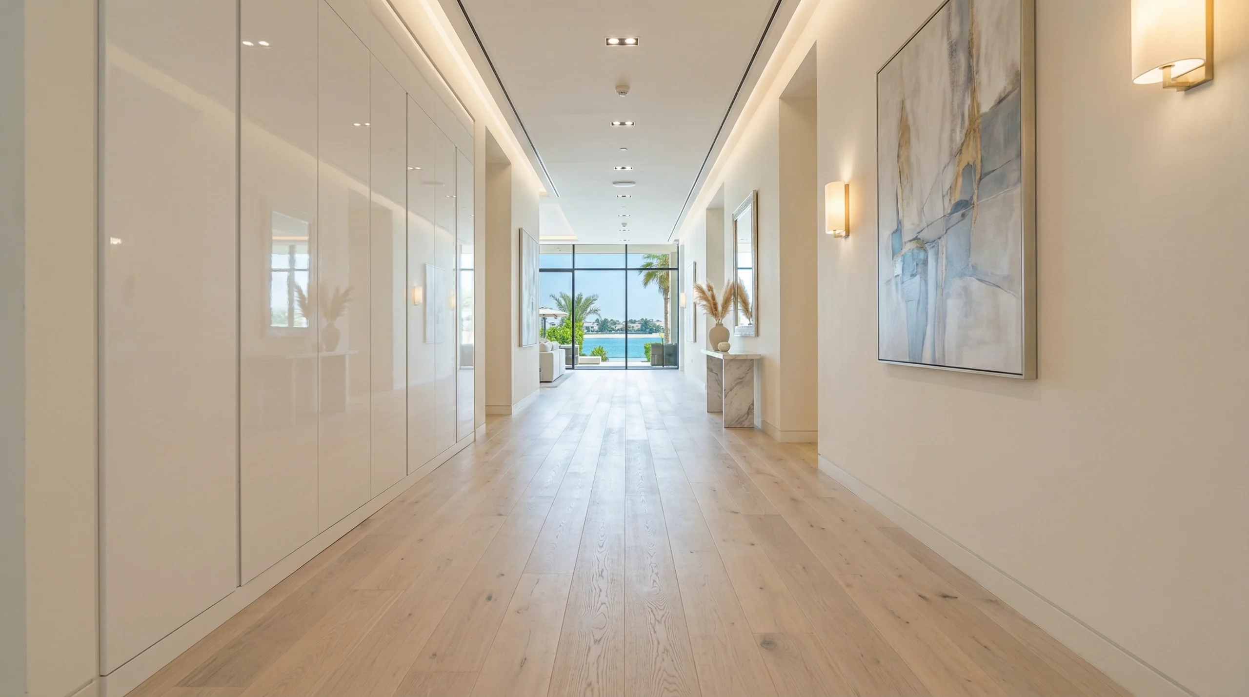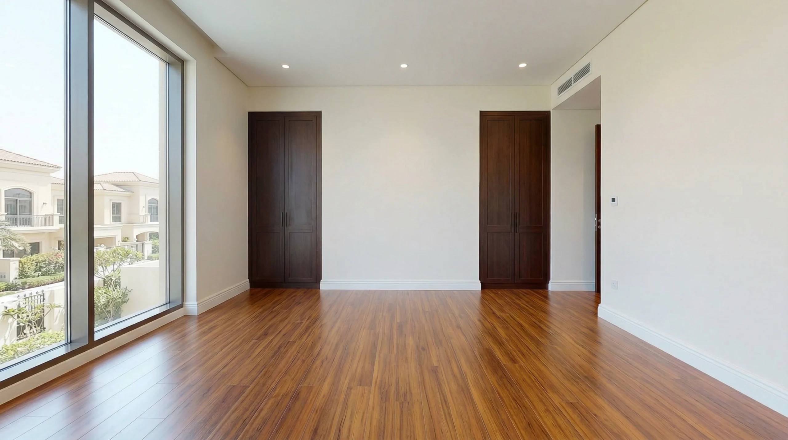 Color selection influences perceived room size, light reflection, and maintenance visibility. Light oak and blonde finishes brighten spaces and hide the dust that accumulates quickly in Dubai’s environment. Dark walnut and espresso tones create sophisticated aesthetics but show every sand grain and water spot, requiring more frequent cleaning. Mid-tone hickory and natural oak balance visual warmth with practical maintenance, explaining why they represent 45% of our residential installations. We guide these decisions based on your lifestyle factors—homes with children and pets benefit from mid-tones with textured surfaces that camouflage scuffs, while adult-only properties can carry darker finishes successfully.