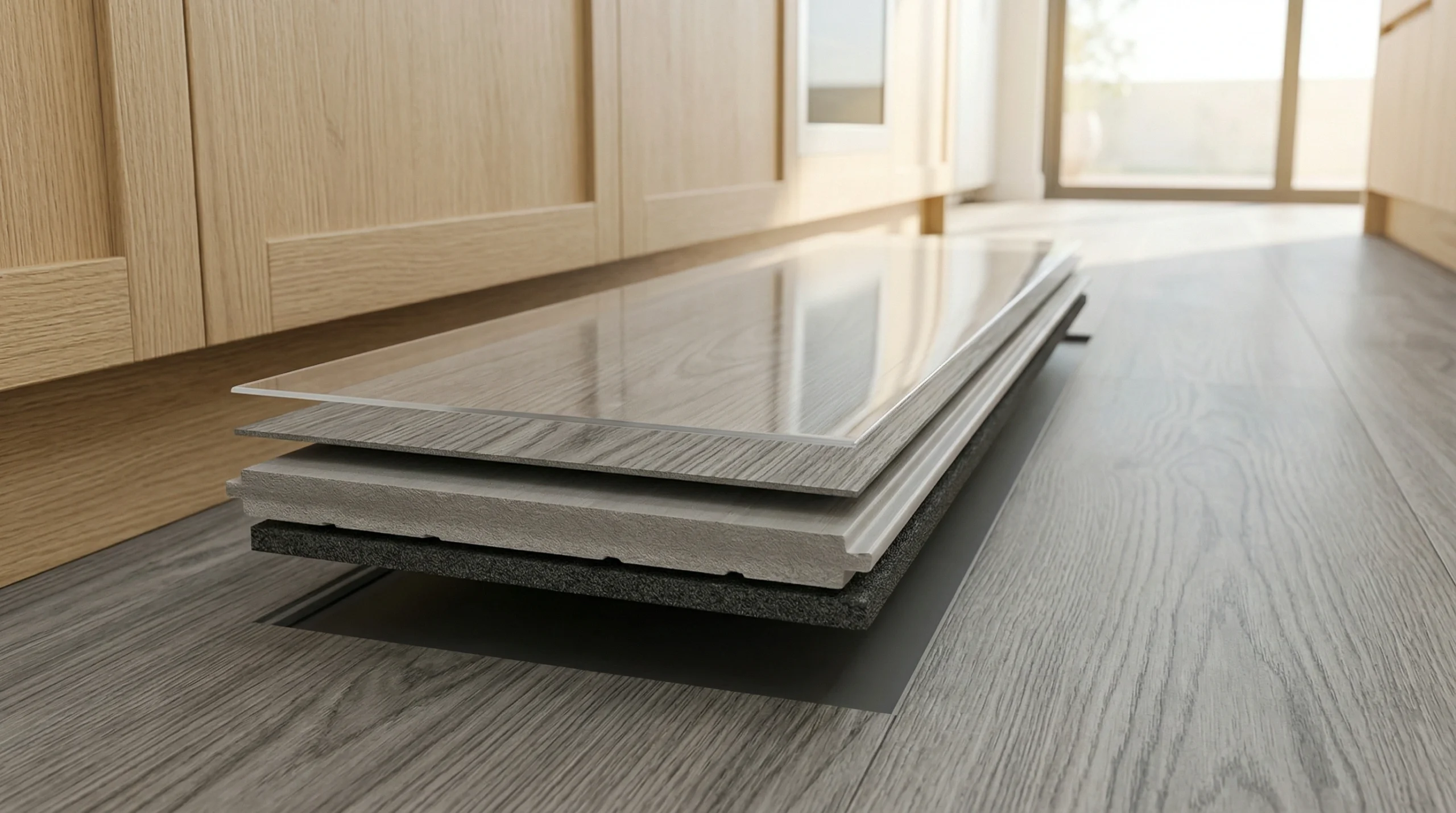 Premium SPC flooring features six distinct layers, each engineered for specific performance characteristics. The UV-cured wear layer at the surface determines scratch and stain resistance, measured in AC ratings from AC3 (residential) to AC5 (heavy commercial). We recommend AC4 minimum for Dubai homes due to sand tracked in from outdoor areas, and AC5 for commercial spaces. This 0.3mm to 0.7mm coating withstands stiletto heels, furniture dragging, and the abrasive sand particles that scratch softer flooring materials.