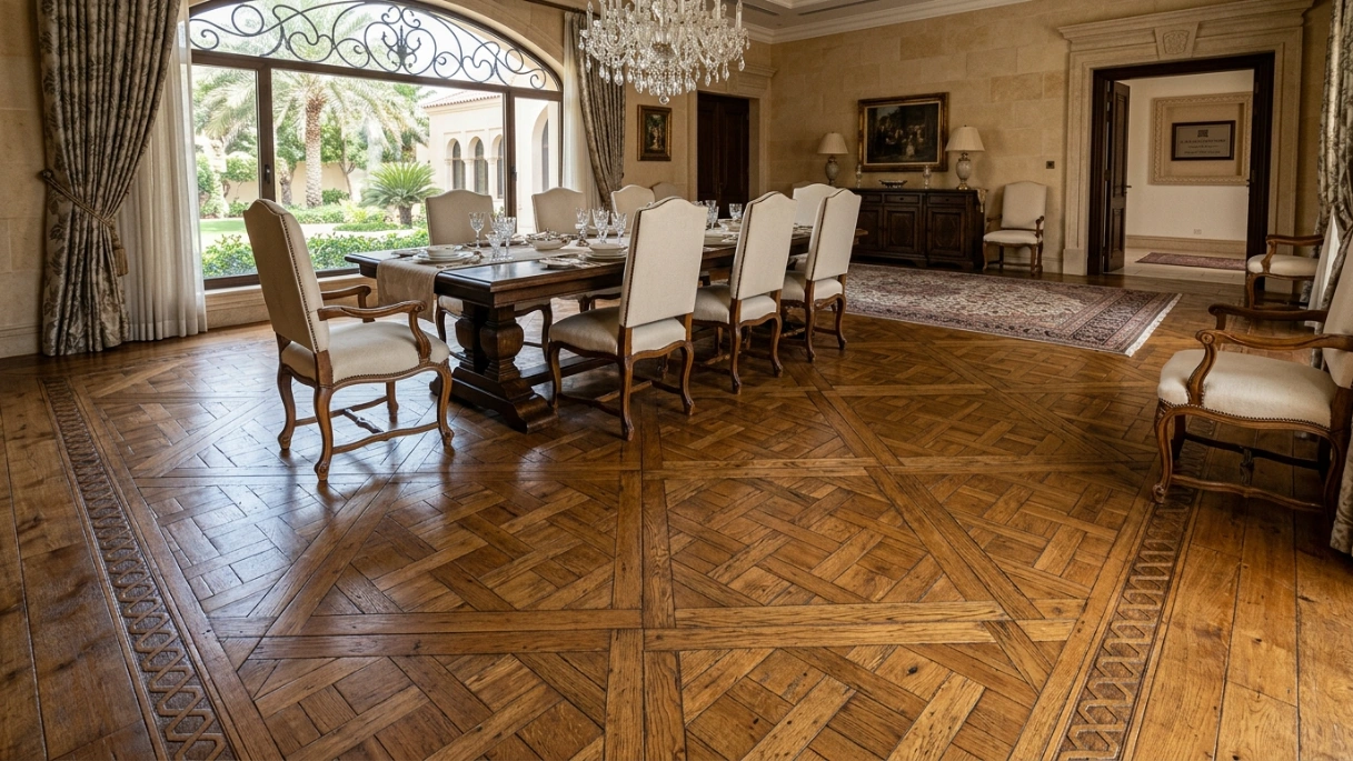 Parquet flooring transforms wood into geometric art, using small blocks or strips arranged in patterns like herringbone, chevron, basketweave, or custom designs. This flooring style brings European elegance to UAE properties, creating visual interest and timeless sophistication in formal dining rooms, executive offices, and luxury retail spaces. We’ve installed parquet patterns across 340+ projects, from classic herringbone in Palm Jumeirah villas to custom arabesque-inspired designs in private majlis spaces.