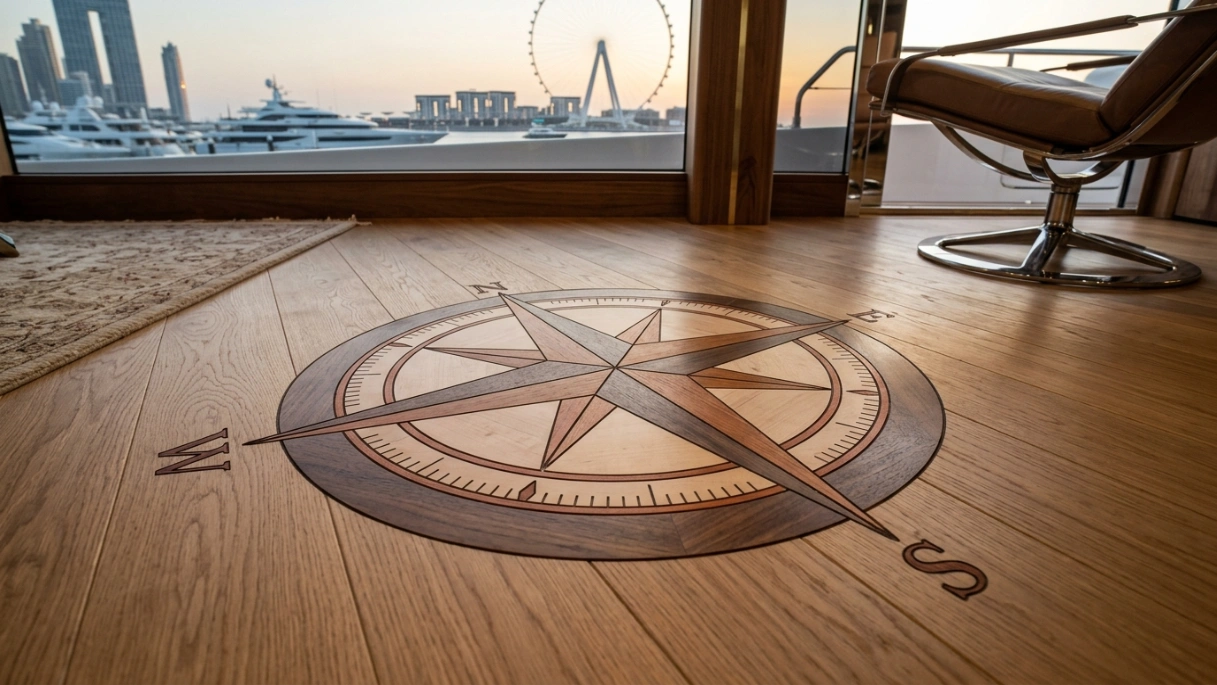 Custom inlay work represents the ultimate expression of wooden flooring artistry. We’ve created borders using contrasting wood species, incorporated arabesque-inspired geometric designs in majlis floors, and inlaid family crests and corporate logos in executive office installations. These custom elements require advanced woodworking skills, specialized equipment, and the artistic sensibility to balance boldness with taste. The result becomes a permanent art piece integrated into your floor.