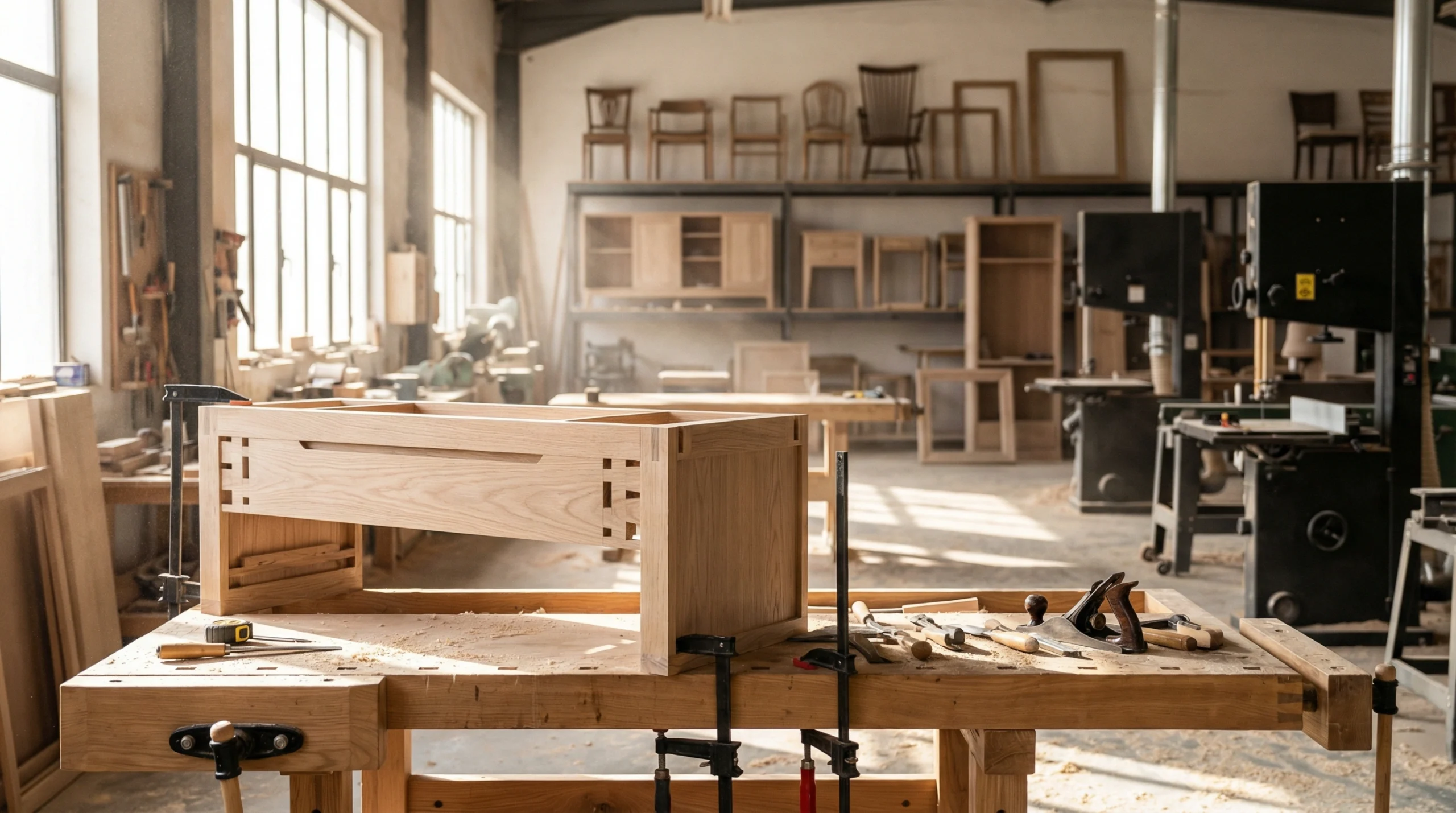 Our construction approach starts with wood selection. We use kiln-dried hardwoods acclimatized in Dubai for minimum 60 days before fabrication begins. This pre-conditioning allows the timber to stabilize at the moisture content it will maintain in your home—typically 6-8% in air-conditioned Dubai residences. Quarter-sawn cuts reduce seasonal movement. Floating panel construction allows the inevitable micro-expansions without creating stress cracks. Every joint receives marine-grade adhesives proven in UAE humidity conditions.